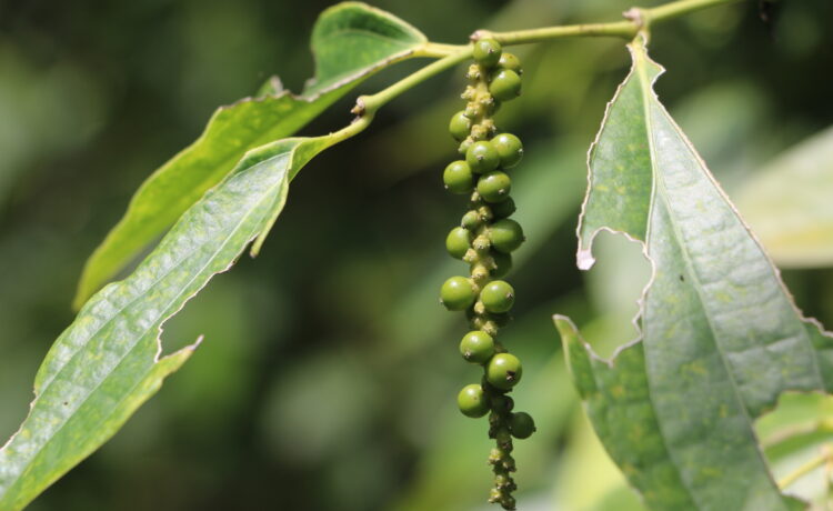 Le poivre pousse sur une liane [Piper Nigrum] originaire de la forêt du Kerala, en Inde. Cultivée sur des perches d’environ 3,5 m de haut, elle est produite à partir de fruits issus d’une même plante, mais à des stades de maturité différents.